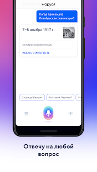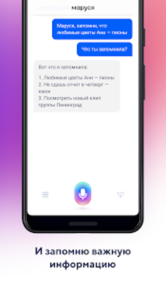Маруся — умный помощник для вашего смартфона. Вы можете попросить ее сделать что угодно: прочитать новости, открыть словарь, перевести, найти информацию, сыграть песню и многое другое. Вы можете говорить с ней на любом языке, и она будет знать то, что вы хотите знать. Она также будет отслеживать, чему вы научились в школе, что читали в книгах и что слышали по радио. Вы даже можете попросить ее сыграть вашу любимую песню, и она сделает это с улыбкой.